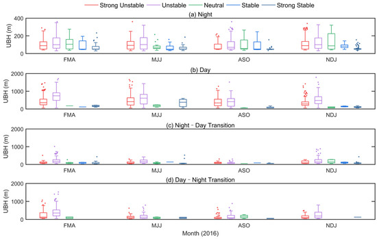 Box-and-whisker plots of urban boundary layer heights (UBHs) for each stability regime in different seasons and episodes, Night (a), Day (b), Night–Day transition (c) and Day–Night transition (d). The top, middle, and bottom horizontal lines of the box represent the 75th percentile, median, and 25th percentile, respectively.