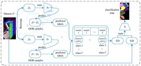 The aforementioned knowledge distillation methods for HSI classification primarily focus on limited labeled samples, domain adaptation, and universal models. Our method first employs knowledge distillation to address the issue of label noise in HSI classification. While similar to these methods in utilizing knowledge distillation to generate soft labels, our approach differs by integrating knowledge distillation within an ensemble learning framework. In this framework, the resampling strategy and out-of-bag (OOB) error estimation are used to produce more robust soft labels. Our goal is to enhance the model’s robustness under label noise conditions, ensuring that the student model can still effectively distinguish categories in its final output.
