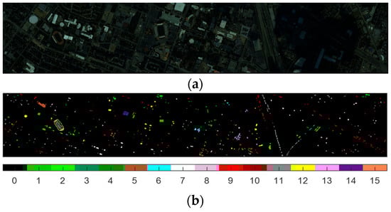 False-color image and reference map of the HOU. (a) False-color image created from a combination of three spectral bands. (b) Reference map detailing the ground truth classification.