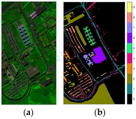 False-color image and reference map of the PU. (a) False-color image created from a combination of three spectral bands. (b) Reference map detailing the ground truth classification.