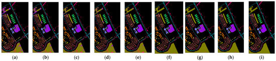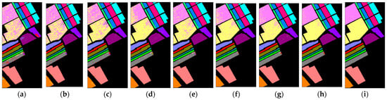 We conducted a comparative evaluation of our proposed END method against several state-of-the-art approaches, including MSSG [], DCRN [], AAN [], TCRL [], SLS [], and MLN []. Additionally, we compared the proposed method with the base network 2D-CNN and a traditional ensemble method, random forests (RF) []. For consistency, we adhered to the parameter settings specified in their respective publications. In the case of MSSG, the segmentation scale parameter was optimized to 0, replicating the best-performing configuration from the original experiments. To ensure standardization of the training data, we randomly sampled 50 instances from each class and ran each method ten times to obtain average performance metrics. With a fixed noise rate (r) of 0.3, each algorithm was executed 10 times, and the average results were used for comparison. Table 2, Table 3 and Table 4 provide a detailed analysis of the classification performance on the SV, HOU, and PU datasets. Figure 5, Figure 6 and Figure 7 display the classification maps for the three HSI datasets after a single run of each method.