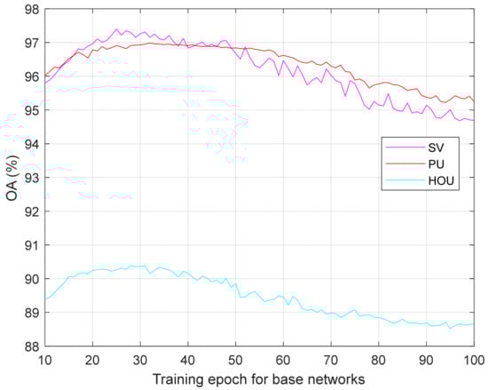 To ensure that the effectiveness of our method in handling label noise is not merely a consequence of using advanced base network models, we initially implemented our approach with a 2D-CNN as the base network. In subsequent experiments, we will also validate our method using a 3D network, specifically the spectral–spatial residual network (SSRN) [].