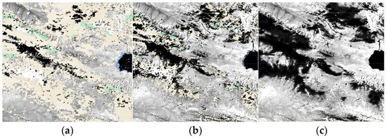 Preprocessing rendering. (a) Quality check and cloud mask; (b) fill in missing values by temporal filter; (c) fill in missing values by spatial filter.