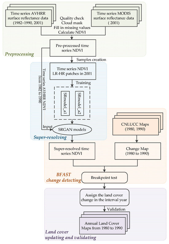 In this paper, a time series land cover mapping method is proposed to produce an annual land cover dataset at 30 m resolution with high temporal consistency for the years before 1990 for which it is very difficult to retrieve 30 m satellite data. The proposed method employs the SRGAN model to construct an SR network to improve the 5 km NDVI from AVHRR to 250 m NDVI in the first place; subsequently, the BFAST change detection algorithm was used to analyze the relationship between the variations from the annual 250 m NDVI based on SR and the CNLUCC land cover datasets to quickly update the annual land cover datasets.