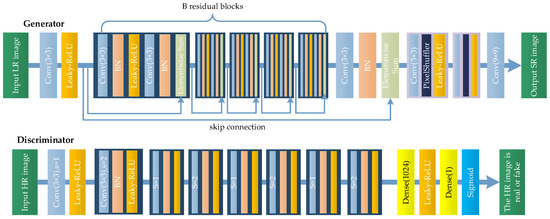 The structure of SRGAN is shown in Figure 7. The generator utilizes B residual blocks to extract image features and employs skip connections to enhance the flow of information across layers and mitigate the vanishing gradient problem associated with increasing network depth. Subsequently, a sub-pixel convolutional layer (PixelShuffler) is applied to upscale the spatial resolution of the input image. The generator was trained in the constructed LR-HR image pairs (), and the resolution of the generated images was magnified ×4. To distinguish between the real HR images and the generated SR images, the discriminator comprises eight convolutional layers, which use stride convolutions to reduce the image resolution and compute redundant information. Then, two dense layers and a Sigmoid activation function are used to scale the discriminator’s output to the range of 0–1, representing whether the input image is real or generated.