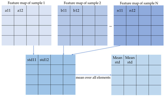We improved the training step using recent advances in image generation that improve the stability of the training process. Minibatch standard deviation [38] was used to enhance the diversity of the generated images. This method computes the standard deviation of each feature at every spatial position over the minibatch, averages these estimates across all features and spatial positions to obtain a single value, and then duplicates and connects this value to all spatial positions and the entire batch, to create an additional feature layer (see Figure 8). This layer helps the generator produce more diverse images and makes the discriminator more sensitive to differences among samples. The feature layer is inserted at the end of the discriminator in this study.