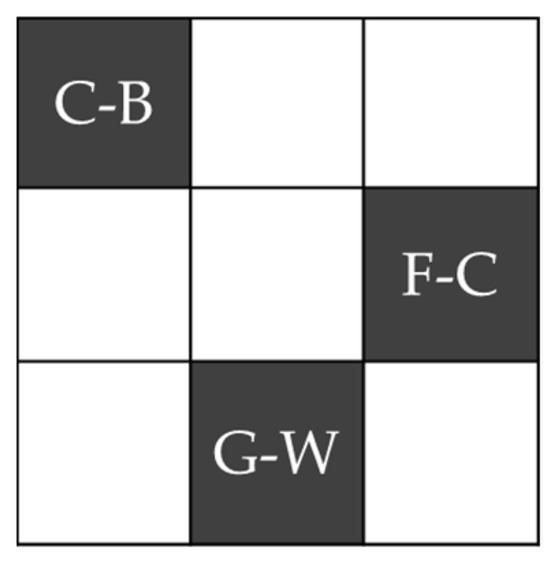 Example of change pixels for 3 × 3 grids (C: Cropland, F: Forest, G: Grassland, W: Water body, B: Built-up land, and U: Unused land).