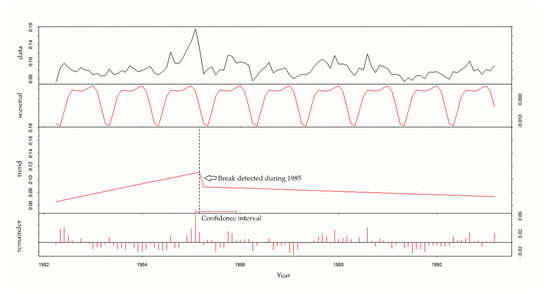 Since a comprehensive explanation of the algorithms can be found in [42], we provide a brief overview here. The algorithm incorporates a decomposition model that decomposes the time series into trend, seasonality, and residual components, combined with an iterative process for detecting breakpoints through structural change methods [47,48]. The decomposition model is expressed as follows: