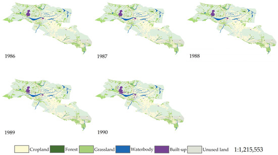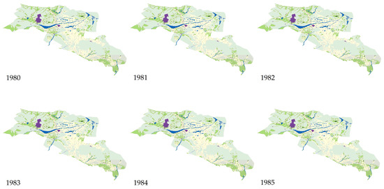Based on the procedure in Section 2.3.4, the land cover maps from 1980–1990 were updated and they are shown in Figure 12.