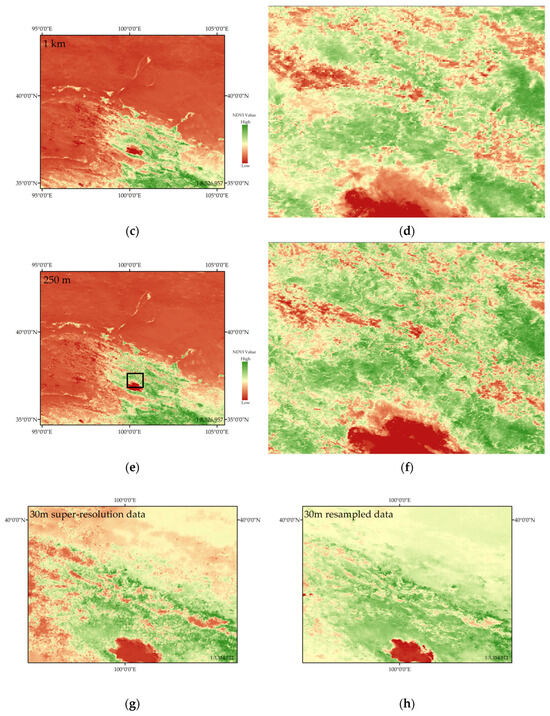 In addition to quantitative analysis, we visually interpreted the results of super-resolution (see Figure 14). Figure 14a,b display the original AVHRR NDVI data from the Qilian Mountains area in June 1986. Figure 14b–f present super-resolution results at 1 km and 250 m. The left column shows overall maps of the study area, while the right column provides detailed enlargements of the black boxed region. Figure 14g illustrates the super-resolution of Figure 14e to 30 m, and Figure 14h shows the nearest neighbor resampling of Figure 14e to 30 m. After applying super-resolution to the coarse spatial resolution AVHRR data, not only did the image resolution increase, but the details and texture characteristics became richer, better preserving high-frequency information and providing clearer outlines of structures in the image. A comparison between 30 m resampled data and super-resolution data revealed that the resampling method did not introduce blurring, noise, or artifacts. This indicates that when the magnification factor of SR is too high, as in this study where it increased from 4 km to 30 m by almost 130 times, it does not necessarily result in a clear high-resolution image but may introduce noise that distorts the image. Therefore, selecting the appropriate magnification factor is crucial for the accuracy and results of SR models.