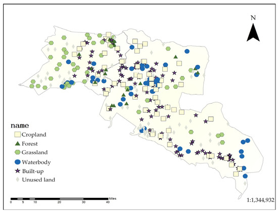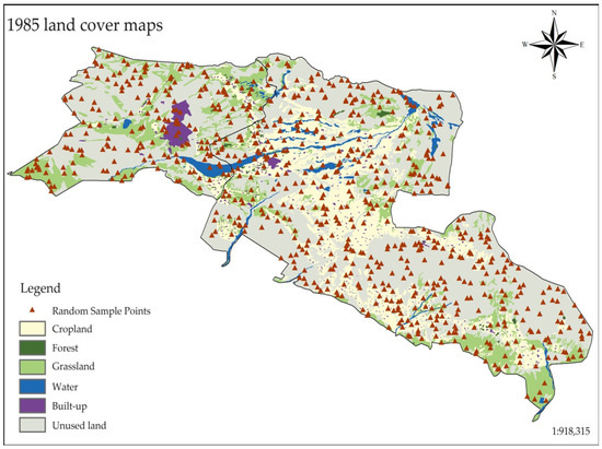 Currently, there is no annual land cover sample dataset available for the years 1980–1990 in the study area; only samples from 1986 can be collected. Therefore, it is not possible to evaluate the mapping performance of updated land cover datasets for each year. By randomly generating 1000 spatially uniform sample points within the study area (Figure 17) and comparing the consistency between the dataset produced in this study and CLUD-A dataset, an annual consistency table is presented in Table 5. These randomly generated sample points are objective, allowing for an unbiased comparison of temporal consistency between the datasets. Table 5 indicates that the 1000 sample points exhibit high temporal consistency in land cover types, with consistency percentages exceeding 95% for all years except 1980 and 1990, which both utilized CNLUCC products. The high temporal consistency between consecutive years indicates that the two datasets exhibit significant similarity and continuity in annual changes and trends in land cover types from 1980 to 1990. For instance, both datasets show a substantial increase in built-up areas and a decrease in unused land and forested areas. Conversely, the error rates between consecutive years reveal that there is approximately a 2% discrepancy in land cover types or change trends between the two datasets.