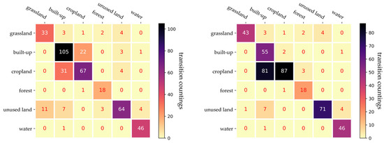 Confusion matrix for our land cover map (left) and CLUD-A (right) in 1986.