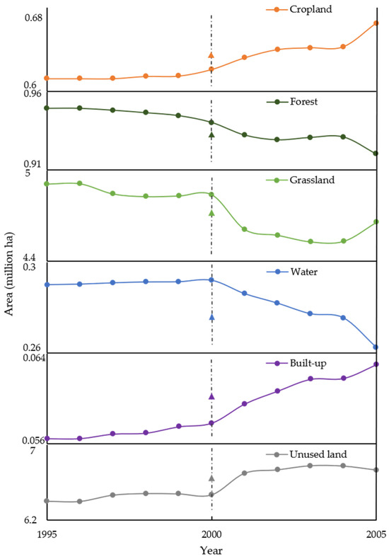 Area change in different land cover classes from 1995 to 2005. The fluctuations for each land cover type are enlarged using the different ranges of y-axis.
