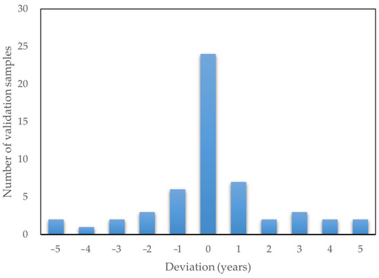 Before conducting change detection, we utilized the CNLUCC product to obtain the land cover change map from 1980 to 1990. Changes primarily occurred in urban expansion and increase in cropland, which aligned closely with the quantitative statistical trends in area change, thus reinforcing the mapping performance from change perspectives. To assess the accuracy of the change detection analysis in determining the change years, this study selected 54 samples from the changed pixels where there was a notable shift in land cover types over five years. Subsequently, using HR images from Google Earth and Landsat time series, the precise change years were visually interpreted (see Figure 19). The temporal and spatial distribution of pixel changes in the study area is also illustrated in Figure 19. The identified change years from the change detection algorithm were compared with the actual change years of these test samples to evaluate the accuracy of the detection results. Considering the absence of early HR images before 1986 and the uncertainty in the visual interpretation of change years, a confidence interval of ±2 years was employed for the comparison. This comparison revealed a 77.78% consistency between the detected change years and the actual years from high and medium-resolution images (where four fifths of the samples had detected change years matching the visually interpreted change years). The deviation in years is depicted in Figure 20, with negative values on the x-axis indicating that the detected change years precede the actual change years, while positive values indicate the opposite.