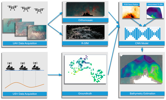 - Alevizos, E.; Nicodemou, V.C.; Makris, A.; Oikonomidis, I.; Roussos, A.; Alexakis, D.D. Integration of Photogrammetric and Spectral Techniques for Advanced Drone-Based Bathymetry Retrieval Using a Deep Learning Approach. Remote Sens. 2022, 14, 4160. [Google Scholar] [CrossRef]