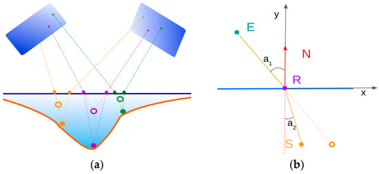 (a) Concept sketch of the proposed refraction-aware structure from motion (R-SfM) method. Our method estimates the true point locations (solid points) during the bundle adjustment stage of SfM. This is in contrast to most other approaches, which first perform standard SfM, obtaining wrong position estimations (rings), then attempting to correct them in post-processing. (b) Refraction geometry. Point S is observed by E through a planar refractive interface with normal N. Point R is the apparent position of S on the interface. Snell’s law determines the relationship between the angles a1 and a2.