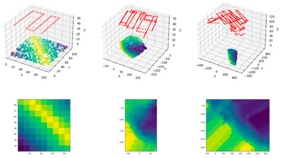 We generated three different simulated areas (see Table 1 and Figure 3). For the first area (named GS), we used a simple ridge-shaped geometry to represent the seabed and generated the drone trajectory over the area. Five different versions of this area were produced with different maximum depths (0–20 m). For the other two areas (named RSA and RSB), we used real data from actual surveys to extract the seabed and the drone trajectory. Depth values provided by the USV were interpolated to generate these more realistic setups. The drone trajectories were extracted from the GPS data.