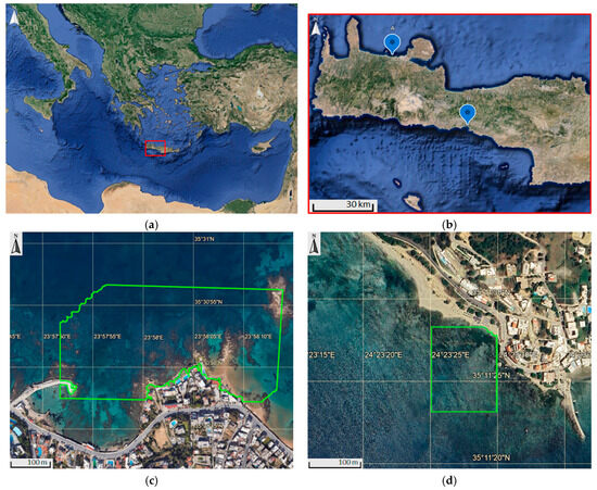 Overview of the study areas, Kalamaki and Plakias. (a) The study areas are located in the western and central parts of the island of Crete, Greece (red region). (b) Kalamaki beach is located on the north shore (35°30′50N, 23°57′50E), while Plakias is on the south (35°11′25N 24°23′30E). (c) Satellite imagery of Kalamaki. (d) Satellite imagery of Plakias. Source: Google Earth. The areas highlighted with green in (c,d) correspond to the regions of interest that are used for training and testing purposes by combining UAV and USV measurements.