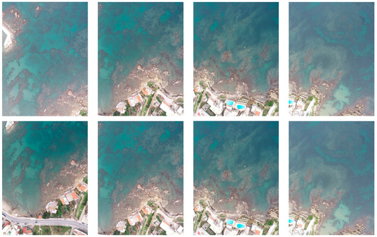 Examples of 8 out of 810 images acquired with the UAV at Kalamaki beach. The images capture portions of the bottom-center area of the sea region highlighted in green in Figure 4c.