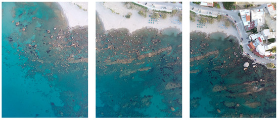 Examples of 3 out of 440 images acquired with the UAV at Plakias beach. The images capture portions of the top-right area of the sea region highlighted in green in Figure 4d.