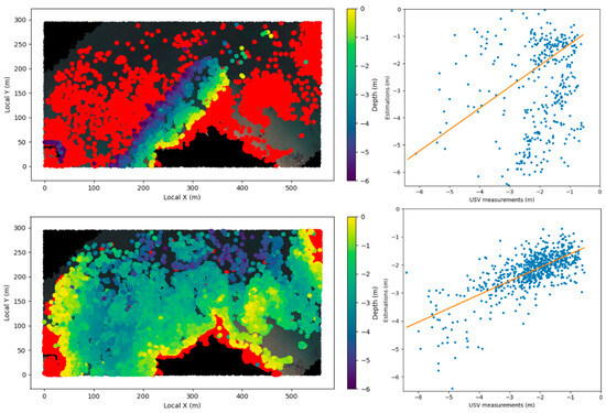 Sparse SfM (top)/R-SfM (bottom) estimations and corresponding scatter plots of test points on the Kalamaki dataset (area highlighted in green in Figure 4c). The red points on the estimation maps represent points with depth outside of the colormap range [−6 m, 0 m].
