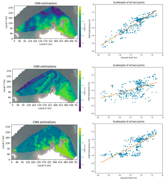 CNN R-SfM and RGB, CNN simple SfM and RGB, and CNN RGB only estimations and corresponding scatter plots of test points on the Kalamaki dataset (area highlighted in green in Figure 4c).
