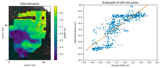 The training procedure of the CNN consists of a data preprocessing step and the training routine. The data preprocessing required constitutes the formulation of multi-channel input tiles and their respective labeled output, which the network utilizes together. The tiling procedure with the acquired data was followed for several reasons. Firstly, the acquired depth measurements are not dense over the whole imaged area and therefore, the training can only be performed in specific parts of the imaged area. The tiling allows one to select only the annotated regions and exclude the rest. For the data preprocessing, the training input was created from tiles of the acquired RGB data of size 128 × 128 pixels that include four channels, three channels for the logarithmic band ratios (blue/green, blue/red, and green/red) and one for the R-SfM surface. The labeled output tiles of the training set consist of single-channeled 128 × 128 pixel tiles of interpolated USV depth that depict the depth values of the respective input. In the case of R-SfM and USV data, a thin-plate spline interpolation is applied within the region of each patch in order to fill each pixel with usable data, since the original data are composed of sparse point measurements. The training/testing sets were created by splitting randomly in a ratio of 60/40, while the USV testing points neighboring less than 3 m from the training patches were discarded to minimize the effect of spatial auto-correlation during testing.