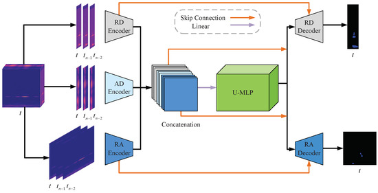 This paper aims to efficiently learn omni-dimensional spatio-temporal dependencies from radar data without increasing computational complexity. Three main insights guide our approach. First, the success of combining 3D CNNs and transformers benefits from the strong ability of 3D CNNs to extract local spatio-temporal features and the capacity of transformers to aggregate long-range spatio-temporal relationships. However, the computational burden associated with the attention mechanism is quadratic in both time and space. In contrast, Metaformer [35] retains the full encoder–decoder architecture of the transformer model and employs an attention-free structure, reducing computational costs while maintaining robust spatio-temporal modeling capabilities for complex scenarios [36,37,38,39]. Motivated by this trend, our work introduces Metaformer in the fusion stage as a supplement to the global feature extraction capabilities of 3D CNNs. Secondly, Metaformer splits the transformer into a meta-architecture and a token mixer, where the latter drives efficient feature mixing. Notably, Metaformers with multilayer perceptron (MLP) mixers [40,41] have shown competitive performance and efficient low-level optimization. However, while MLP-based methods perform well in many tasks, they may not be suitable for radar data. In fact, several studies indicate a close relationship between the cross-shaped receptive field and radar characteristics. Cenkeramaddi et al. [42] and Gupta et al. [43] showed that the targets in RA images of FMCW radar typically distribute along the horizontal or vertical axis, presenting a striped pattern. Bi et al. [44] further explained that a single target generates multiple scattering echo points along the coordinate axes. Additionally, Nguyen et al. [45] confirmed the existence of this striped feature through the visualization of radar signals. Inspired by the cross-shaped receptive field of TransRadar, which enhances radar feature extraction, and the demonstration by PeakCom [46] that dilation factors create guard units to reduce interference, we implemented AS-MLP [47] as a radar feature extraction module with a cross-shaped dilation receptive field in the latent space encoder. In the decoder, a CNN structure is employed to reduce parameters while restoring the signal. The framework aligns well with the characteristics of the radar radio-frequency (RF) images while maintaining the robust spatio-temporal modeling capacity of the transformer. Finally, the interaction between features from different views and levels enables the model to achieve a more thorough comprehension of radar data, improving the accuracy of perception tasks.