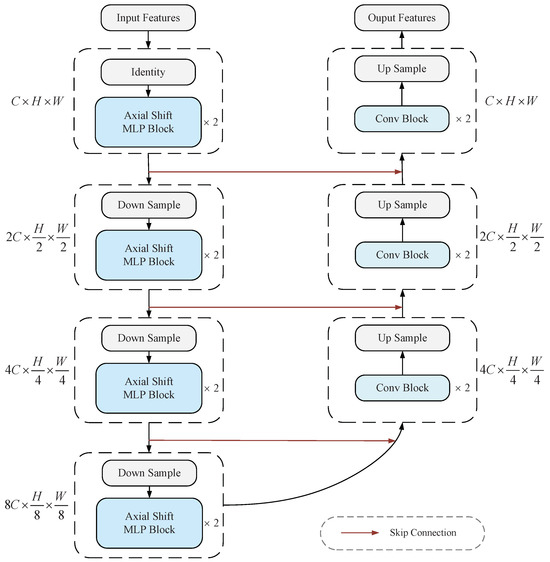 The primary objective of the decoder in U-MLP is multi-scale feature fusion. Skip connections are introduced to integrate diverse semantic information across resolutions. Furthermore, dimensionality reduction is employed alongside the skip connections, facilitating effective feature fusion while reducing computational complexity. The relationship between features in layers l and can be expressed using the following formula: