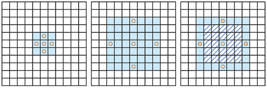 The receptive field of U-MLP. The original receptive field, the receptive field proposed in this paper, and the equivalent guard band are displayed from left to right. Feature points, the guard band, and feature regions are distinguished by orange, a blue diagonal grid, and light blue, respectively.