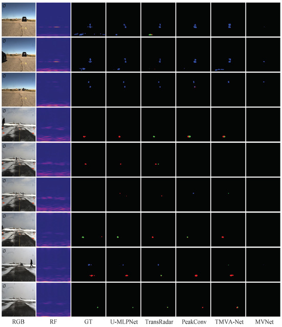 The results for the RA view are illustrated in Figure 6, showing that the U-MLPNet and TransRadar algorithms have a considerable margin of improvement over other algorithms. Apart from MV-Net, the remaining algorithms exhibit high recognition rates for the vehicle class. Distinguishing between pedestrians and bicycles presents a significant challenge for other algorithms due to the close similarity in their RF images. In contrast, our model is better at distinguishing pedestrians and cyclists (rows 4–7). PeakConv and TMVA-Net perform well in pedestrian recognition but tend to be confused in multi-object scenarios (row 8).
