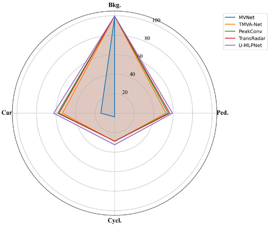 The visual effects of RD view segmentation using different algorithms are depicted in Figure 7. It can be observed that our U-MLPNet demonstrates greater accuracy in identifying car categories compared to other algorithms (rows 1–3), which is attributed to the ability of the proposed model to fully integrate global spatio-temporal information. When pedestrians cross the sensor at close range, U-MLPNet accurately provides segmentation results (row 4), which is crucial for autonomous driving tasks. Additionally, our model maintains reliable segmentation performance in multi-object scenarios (rows 5–6). Finally, we conduct a comprehensive evaluation of the performance of different algorithms across various categories using polar plot visualization. As shown in Figure 8, each line in the polar plot corresponds to a specific algorithm, with the distance from the center indicating the segmentation performance of the algorithm in the respective category. It is evident from the plot that our proposed algorithm excels in all categories. In conclusion, the proposed model extracts more effective semantic features and exhibits higher robustness in segmentation tasks under various conditions, outperforming other algorithms.