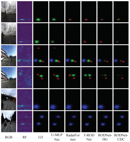 The precision and recall of different algorithms are shown in Table 3. U-MLPNet achieves the best levels of global precision and recall, significantly outperforming other methods. In the RD view, U-MLPNet achieves the best results in both precision and recall, outperforming the second-ranked TransRadar by 2.0% in precision and PeakConv by 0.3% in recall, which are significantly better than the results achieved by the other methods. In the RA view, U-MLPNet has the highest recall (3.3% higher than that of TransRadar), while its precision is slightly lower than that of TransRadar (0.6%) but still clearly superior to that of others. In summary, the improvement in recall for U-MLPNet is particularly significant, indicating its ability to detect correct targets more comprehensively and reduce missed detections. As for precision, U-MLPNet also performs stably, especially in the RD view. This balance between precision and recall makes U-MLPNet more robust and practical in real-world scenarios.
