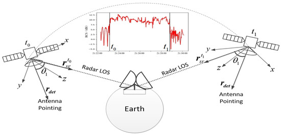 As shown in Figure 5, it is assumed that the half-cone angle of the parabolic antenna is , and at time , the radar detection beam just enters the interior of the parabolic antenna, which is represented on the RCS sequence characteristic curve as the beginning of the step effect and the theoretical angle between the position vector of the satellite to the radar and antenna pointing in the orbital coordinate system is . Similarly, at time , the radar detection beam just leaves the interior of the parabolic antenna, which is represented on the RCS sequence characteristic curve as the end of the step effect and the theoretical angle between the position vector of the satellite to the radar and antenna pointing in the orbital coordinate system is also .