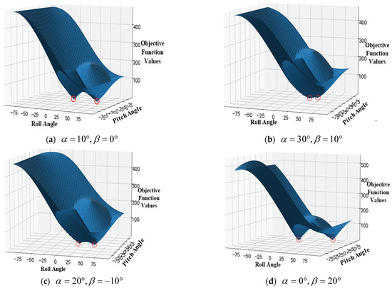 To verify the uniqueness of the solution under the multi-station measurement condition, the varying relationship of the objective function values under different satellite pointing situations in the solution space is shown in Figure 12.