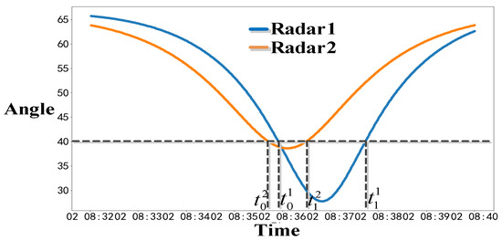 Based on a single-station measurement, an additional measurement station (longitude: 112, latitude: 33, altitude: 0.1) was considered in keeping with the other simulation parameters, the angular curves between the satellite’s position vector to the radars and the inward-facing antenna were maintained using the orbital coordinate system of time shown in Figure 11.
