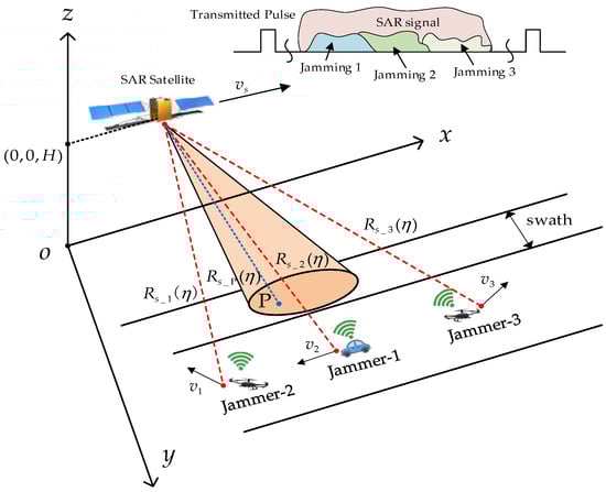 As shown in Figure 1, it is assumed that the platform height of the spaceborne SAR system is H, and the coordinate at the azimuth zero moment is . There are three maneuvering repeater jammers to protect parts of the areas in the imaged swath. The SAR platform moves along the azimuth direction at a speed of . At the moment of azimuth time , the corresponding SAR platform position can be expressed as . There is an arbitrary point target P in the imaged swath as shown in Figure 1, and its position coordinate is expressed as .