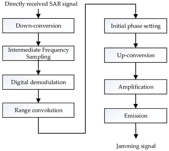 The jamming signal is obtained by the operated convolution between the directly received SAR signal with a short time delay and the jamming scene . Figure 2 shows the generation process of maneuvering the repeater jamming signal. The maneuvering repeater jamming equipment near the imaged swath receives the spaceborne SAR transmitted signal pulse and performs down-mixing and intermediate frequency sampling on the SAR signal. Then, the SAR signal after intermediate frequency sampling is convoluted with the jammer scene to generate a low-power interference signal. After that, the low-power interference signal is up-mixed, the initial phase is set, and finally, the amplification is performed to obtain the final maneuvering forward interference signal and send it to the SAR satellite. Compared with , increases the motion of the jamming equipment, and the Doppler domain is more complex since the Doppler modulation is related to the range history between the SAR sensor and the jammer, which brings greater challenges to anti-jamming technology.