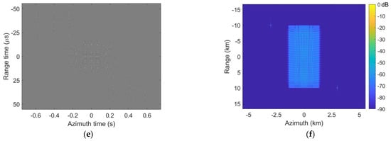 Figure 7 compares SAR raw data and imaging results under different conditions. First, three point targets are assumed in the imaged scene, and their relative locations (azimuth, range) are (−3 km, −10 km), (0 km, 0 km), and (−3 km, −10 km), respectively. The raw data without jamming are shown in Figure 7a, and the imaging result is shown in Figure 7b. Figure 7c,d show the traditional raw data and the imaging result of the imaged scene polluted by jamming, while Figure 7e,f show simulation results with up- and down-chirp modulation. It can be seen that more imaged areas in Figure 7f are polluted by jamming due to the opposite modulation rate in the same PRI. The height of the low-power UAV jammer is 200 m, and the distance from the UAV jammer to the scene center is 15 km. The velocity components in the directions along and across the track are 4 m/s and 3 m/s, respectively.