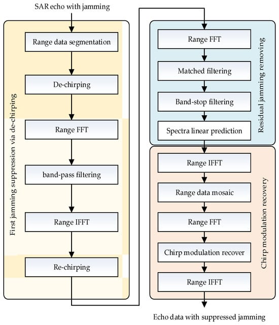 According to the signal model of maneuvering repeater jamming, jamming data would be recorded in the same position within the echo receiving window as the desired SAR echoes, and they have the same range frequency. Jamming data have more complex Doppler modulation due to multiple distributed jammers with flexible flight paths. Furthermore, the interference jamming signal could even be designed as random noise, and jamming data received by spaceborne SAR have the characteristics of both deceptive interference and suppressive interference. Fortunately, mixed jamming data and SAR echoes are related to opposite chirp modulation slopes, when the spaceborne SAR system alternately transmits up and down frequency modulation chirp signals. To separate echoes corresponding to up- and down-chirp modulations, de-chirping combined with frequency filtering is one of the most effective methods since the desired echo energy will be concentrated while the interference signal energy will be dispersed. Besides the first jamming suppression via de-chirping, the residual jamming signals are removed by band-stop filtering and spectra linear prediction. Finally, range frequency modulation recovery is carried out to obtain the final jamming-suppressed raw data. The proposed anti-maneuvering repeater jamming is shown in Figure 8.