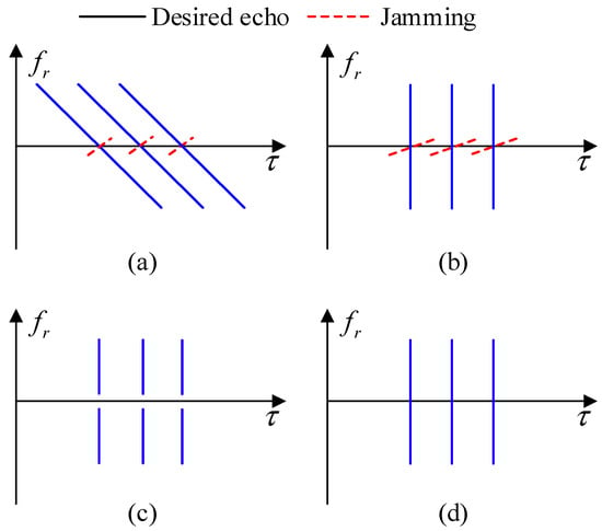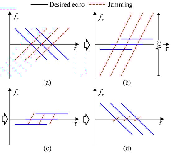 Comparing expressions (10) and (11), the major difference between the desired echo and jamming is the opposite chirp modulation rates in the same PRI, which means that the desired raw data are related to the up-chirp modulation while the jamming corresponds to the down-chirp modulation