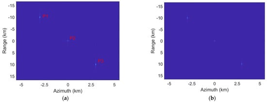 To validate the proposed anti-maneuvering repeater jamming method, simulation experiments on point targets are carried out, while simulation parameters are listed in Table 1. There are three point-targets in the imaged scene, the point-target arrangement is the same as the arrangement in Figure 7. Echo data of the designed point targets with up- and down-chirp signals is shown in Figure 7e, the SAR raw data are polluted by the maneuvering repeater jamming, and the focused SAR image without any jamming suppression operations is shown in Figure 7f.