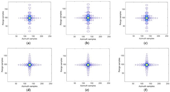 Figure 12 shows the imaging results of the designed point array scene. Figure 12a shows the imaging result handled by the notch filtering, while the imaging result handled by the proposed method is shown in Figure 12b. Compared with the imaging result in Figure 12a, the imaging quality in Figure 12b is improved especially for the range dimension due to the introduced range spectra linear prediction for removed range spectra estimation. Three point-targets in both Figure 12a,b are interpolated, and their contours are shown in Figure 13. The imaging results of Figure 12a have high sidelobes in range due to the removed range spectrum components after range frequency band-stop filtering. With the range spectra linear prediction operation, the missed spectrum components are estimated, and the imaging quality is improved, especially for the range direction as shown in Figure 13d–f. Furthermore, imaging quality parameters including geometric resolution, PSLR (peak sidelobe ratio), and ISLR (integrated sidelobe ratio) are evaluated and summarized in Table 2. From Table 2, it can be seen that the sidelobe level has improved by about 5 dB compared with the conventional notch filtering method.