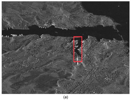 To further validate the proposed anti-maneuvering repeater jamming method, a simulation experiment on a distributed scene is carried out. A focused SAR image is introduced for the imaged scene simulation, the red rectangle area in Figure 14a indicates the protected area with high-value targets, which means that the SAR raw data of the protected area will be polluted. Furthermore, the horizontal direction is the azimuth direction, and the vertical direction is the distance direction. There are two jammers designed to protect the large imaged area in this simulation, and these two jammers protect different areas. Their flight heights are 200 m and 300 m, respectively. The distances from the scene center to the jammers are 15 km and 20 km, respectively. The velocity components in the directions along and across the track of the first jammer are 4 m/s and 3 m/s, respectively, while the velocity components of the second jammer are 2 m/s and 5 m/s, respectively. Figure 14b shows the imaging result of the polluted SAR raw data, the whole SAR image quality is obviously reduced especially for the protected area. The signal-to-jamming ratio (SJR) in the polluted area is −15 dB as shown in Figure 14b. Figure 14c shows the imaging result after jamming suppression but without range spectra linear prediction, while the jamming signals are obviously suppressed. With the range spectra linear prediction, the final focused SAR image is shown in Figure 14d, which further validates the proposed anti-maneuvering repeater jamming method. Taking the proposed maneuvering repeater jamming method, the SJR in the polluted area is improved to 32.25 dB.
