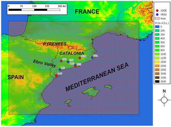 The XRAD has operated in real-time since 2002 and consists of four C-band weather radars with a single polarization. The radars are low-power systems. However, their distribution allows the acquisition of good products for Catalan and the surrounding area. They have a 6 min cycle in which the antenna scans 16 times the atmosphere in 15 elevations: the lower one is scanned twice, one with a range of 240 km and the second with a range of 130 km. The rest of the elevations have a range of 130 km too. Then, each radar provides a long-range PPI (Plan Position Indicator) for the lower elevation and 15 short-range PPIs, integrated into a unique volume file every 6 min. Once the full scan has finished, the computer sends the data to the central office processor, which generates multiple products for single radars or the composition of all. In the present study, we consider the CAPPI (Constant Altitude Plan Position Indicator) composition for the longest range (see an example in Figure 3, for the same event that Figure 2. Additionally, the daily maximum reflectivity has made the preliminary process easier. The manuscript [36] provides more information about the network.