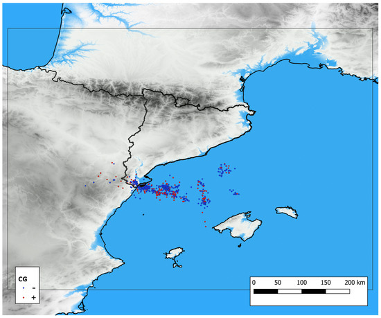 The XDDE was deployed between 2003 and 2006 and has run operationally since 2007. Each of the four detectors (red dots in Figure 1) consists of two types of receptor antennas: one very-high-frequency (VHF) antenna to detect the IC (intra-cloud) flashes and one low-frequency (LF) antenna that registers the CG strokes. The combination of the four sensors allows for a good precision in time (0.01 ms) and space (less than 500 m, over Catalonia). The use of ICs permits the nowcasting of severe weather phenomena [38], while the location of CGs helps to the detection of fires and damages on infra-structures, among others [40]. We have only considered CG flashes because they fit better to radar structures [41]. Figure 2 shows an example of the flashes detected during 19 October 2018, between 17.00 and 18.00 UTC. The episode produced heavy rains and floods in the southern part of Catalonia.
