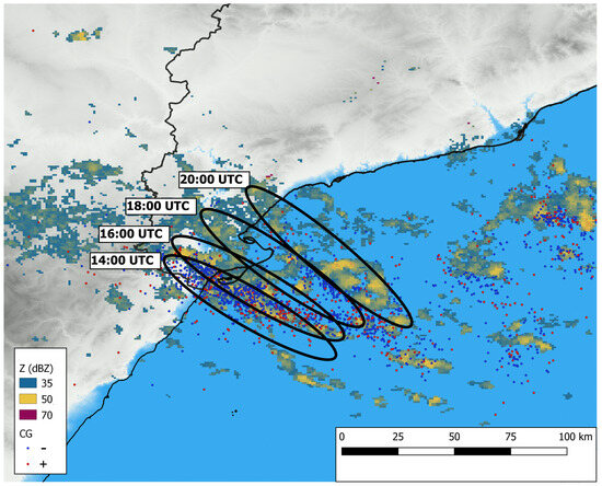 Figure 6 shows an example of the tracking of the QLCS that affected the Southern part of Catalonia during 19 October 2018. The figure shows how the lightning activity decreased notably after the first time of identification (14.00 UTC). In fact, the ellipses of the 16.00, 18.00, and 20.00 UTC show a low number of flashes, indicating the necessity of combining both sources (radar and lightning) to accurately follow the complete path of each system.