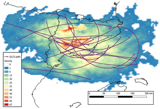In this section, we present the main results referring to the 20 QLCS identified in the studied region during the period 2013–2023, from the point of view of the radar and lightning activity. Figure 8 shows the spatial density of the QLCS over the studied region. This field indicates the number of times (or radar imagery, generated every 6 min) in which the technique detected a QLCS over a certain pixel. As redder is the pixel, more times the algorithm has detected a QLCS in that point. It can be appreciated that the QLCS density decreases as we move far from Catalonia. Although it is possible that there exist some limitations in the identification of some stages of the QLCS in those regions because the structures would be in the worst coverage area, while manually tracking some of the systems, we have observed how the results paths are coherent with the observations.