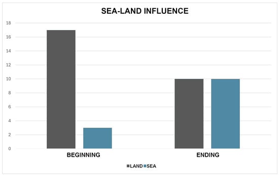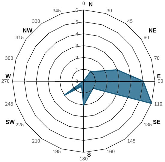 Figure 9 and Figure 10 help to better understand the previous QLCS motion patterns. The first figure shows how most of the QLCSs developed over land, and only three of them formed over the Mediterranean. However, a half of them concluded their life cycle over the sea. There are two causes of this result. First, the environment over sea is less conductive to strong convection than over land, but it can maintain convection for a longer period. Furthermore, convection can also initiate over the sea and move over land. These two points were treated by del Moral et al. (2020) [50] in the region of study or [5,6] in other parts of the world. Figure 10 explains the second cause: the presented wind rose in this figure shows the case number with each principal direction. It is necessary to bear in mind that the main direction results from the complete trajectory, but in most cases, the QLCS changed their direction at least twice. The main observed result is that fourteen of the twenty structures moved between ENE and ESE, that is, with eastern propagation. This is indicative that the general flow over Catalonia dominates the QLCS propagation. However, it is important to bear in mind that thunderstorms propagate perpendicular to the main QLCS direction, usually from sea to land. Then, these cases are conductive to heavy-rain leading to flash floods if the QLCS moves slow, following the convective train model [39,51].