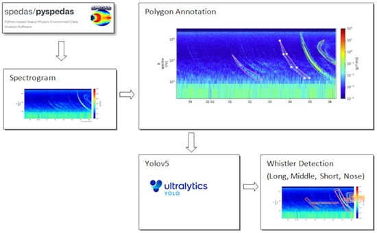 The entirety of raw data from the Arase Satellite for August 2017 has been transformed into 2736 images. All of the data used are 32-bit color PNG files with dimensions of 1200 × 500 pixels, as they are compatible with YOLO’s input data format (eight-bit depth, three-channel png/jpg images). For the dynamic range of intensity, we used the default value from PySPEDAS as mentioned in Section 2.2. If this value changes, it will affect the image produced by PySPEDAS and also impact the detection results. The next step involves identifying images containing whistlers and assigning appropriate labels.